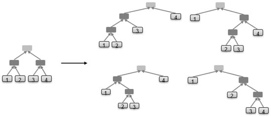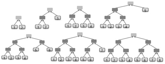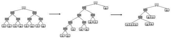 Up to this point, our emphasis has been on a static tree design, in which software nodes are sequentially assigned to the leaf nodes located at the bottom level. We showed that the smaller the tree height (maximal number of levels below the root) is, the better the software update performance is. As software nodes are anticipated to be dynamically added in the vehicle, the tree can be re-designed such that the addition and removal of nodes can be performed efficiently with the minimum tree height possible. The goal is to build a self-balancing Merkle tree that automatically keeps its height small for node insertions and deletions. Self-balancing trees have proven their efficiency for many binary search trees, such as red–black trees and AVL trees [29]. Given that nodes are added and removed independently, the algorithm should be meticulously designed to achieve optimal results, resulting in the minimal achievable tree height. Deviating from the bottom-up approach we have adopted in our study, we can follow a top–bottom approach to add the new leaf node. To explain our approach, we show in Figure 19 an example of a Merkle tree with eight nodes. To add node 6, it needs to move down node 5 to a lower level, add node 6 to the right side, and then calculate their parent node and the root node. When all nodes are added, it ends up with a balanced Merkle tree similar to the static tree we worked with previously.