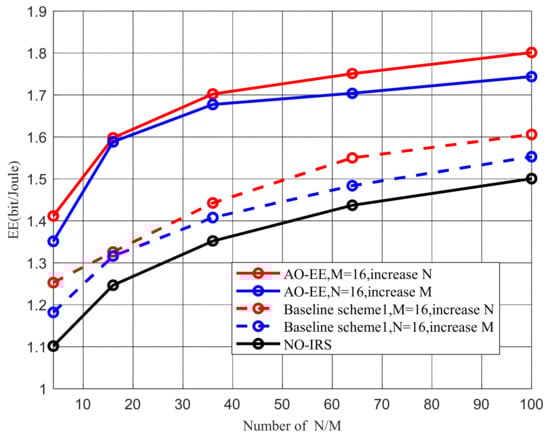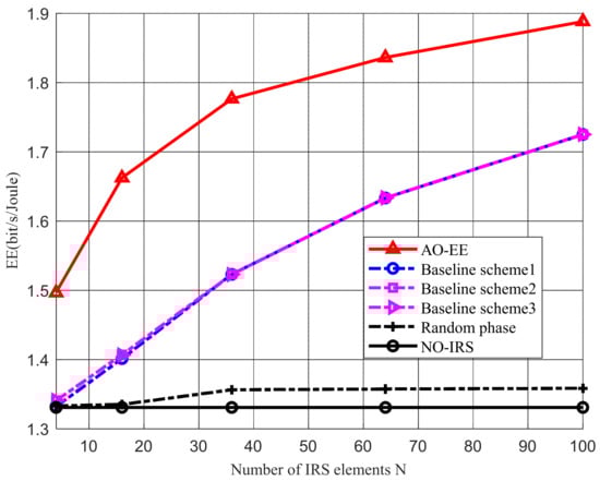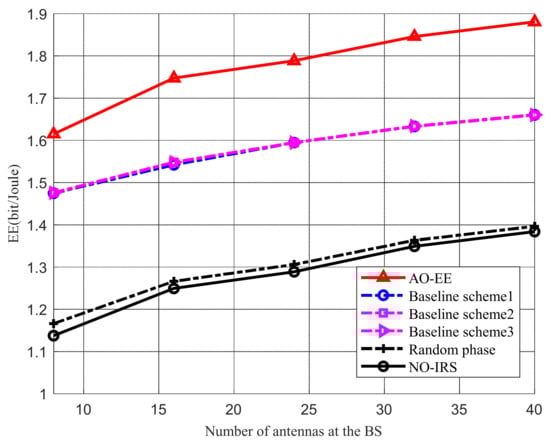 Figure 2 illustrates the relationship between the number of IRS reflecting elements (N) and the system energy efficiency for different algorithms when and . It can be observed that, in the absence of IRS (the NO-IRS case), increasing the number of IRS reflecting elements has no impact on the system’s energy efficiency, resulting in a linear relationship. As the number of IRS reflecting elements increases, the system’s energy efficiency for the other five IRS algorithms (Random Phase, Baseline Scheme 1, Baseline Scheme 2, and Baseline Scheme 3) shows varying degrees of improvement. This improvement is attributed to the gain achieved from both the BS transmit beamforming and the aperture gain provided by IRS, whereas the NO-IRS algorithm only benefits from the gain in the BS transmit beamforming. All four IRS optimization algorithms outperform the Random Phase algorithm, to a significant degree. This demonstrates the necessity of optimizing the IRS phase shift, as, under random phase shifts, the reflected signals may not be properly directed towards the MR, resulting in a substantial reduction in the gains offered by IRS. Furthermore, a similarity is observed in the system performance of the Baseline Scheme 1, Baseline Scheme 2, and Baseline Scheme 3 algorithms. However, when , the proposed AO-EE algorithm surpasses them, achieving approximately 12.41% higher system energy efficiency. Comparing the proposed AO-EE algorithm with the NO-IRS and Random Phase schemes, the system energy efficiency is improved by approximately 35.26% and 37.96%, respectively. Hence, the proposed AO-EE algorithm strikes a favorable balance between computational complexity and system energy efficiency.