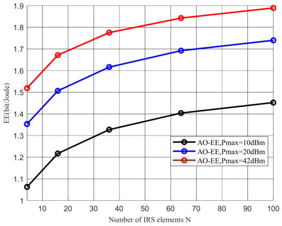 Figure 6 illustrates the variation in the system energy efficiency with BS transmit power for using the proposed AO-EE algorithm at different numbers of IRS reflecting elements. From Figure 6, it can be observed that, as the BS transmit power increases, the system energy efficiency initially improves and then reaches a plateau for different numbers of IRS reflecting elements. Furthermore, under the same BS transmit power, the system energy efficiency increases with the growth in the number of IRS reflecting elements. This is because a larger number of IRS elements can reflect more received signals from the BS, leading to an increase in system energy efficiency. In summary, the results in Figure 6 demonstrate that increasing the BS transmit power and the number of IRS reflecting elements can enhance the system energy efficiency in an IRS-assisted HST communication system.