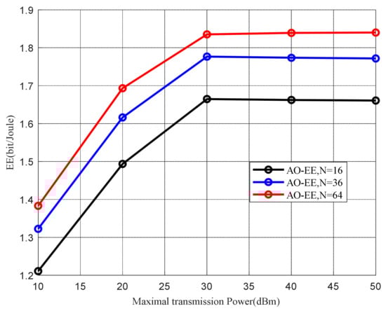 Therefore, is non-decreasing over the iterations in the AO-EE, and has the upper bound due to the transmit power constraint. Thus, the AO-EE algorithm is guaranteed to converge.