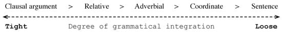 Hopper and Traugott [23] also offered a model that shares much with Matthiessen’s, where “parataxis” is the syntactic independence of clauses and “hypotaxis” is a more integrated clause that is syntactically dependent within another clause’s predicate. Tighter still is “subordination”, which, like “embedding” in Matthiessen’s type, covers all clauses that function as a constituent essential to grammaticality, e.g., verbal arguments.