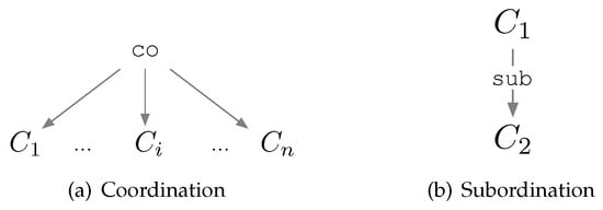 As illustrated in Figure 3, we modeled the two basic hierarchical schemas with the concepts defined above, characterizing inter-clause relations with the same nucleus–satellite pattern in RST. To be specific, coordination is a multinuclear relation that involves two or more clauses (denoted as nucleus node ) dominated by the coordination node , while subordination is a mononuclear relation (denoted as a directed edge ) pointing from the matrix clause (nucleus) to its subordinate clause (satellite).