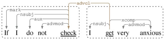 Moreover, the relative subordinate clause “which does sort of go away after 15–30 min” mapping to subgraph modifies the complement “anxious” in the matrix clause “I get very anxious” mapping to subgraph . Thus, a new transformation rule can be derived: