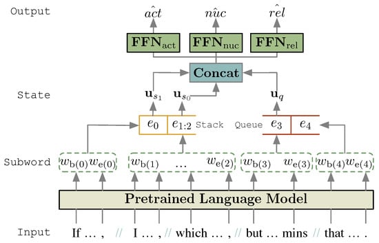 The RST-parsing task generally requires breaking the text into EDUs (i.e., the discourse segmentation task) and linking the EDUs into a DT (i.e., the discourse parsing task). For discourse segmentation, Gessler et al. [17] proposed a Transformer-based neural classifier that enhances contextualized word embeddings with hand-crafted features and achieved the current state-of-the-art performance in the DISRPT 2021 Shared Task on Discourse Unit Segmentation (https://sites.google.com/georgetown.edu/disrpt2021?pli=1, accessed on 1 April 2023). For discourse parsing, Kobayashi et al. [18] explored a strong baseline by integrating previous simple parsing strategies, top-down and bottom-up, with various Transformer-based pretrained language models (PLMs).