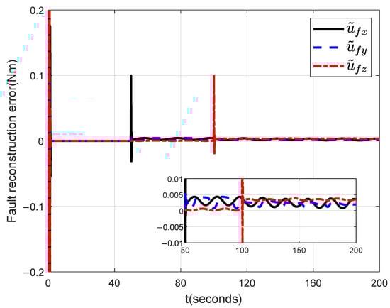 According to the design procedure of the MLO, related parameters are chosen and computed in Table 1. Based on the MLO design, simulation studies on MLO-based actuator fault reconstruction are performed, and related simulation results are provided in Figure 1, Figure 2, Figure 3 and Figure 4. The reconstruction signals and the reconstruction error of actuator faults are respectively demonstrated in Figure 1 and Figure 2, while Figure 3 and Figure 4 illustrate the estimation signals and the estimation error signals of the satellite attitude angular velocity, respectively. From Figure 1 and Figure 2, it can be seen that the MLO can accurately reconstruct actuator faults. Through a series of computations, the reconstruction accuracy of actuator faults reaches 0.005 . From Figure 4, it can be observed that the estimation error signals of the satellite attitude angular velocity converge to zero regions. In other words, the MLO designed using Theorem 1 can accurately estimate the satellite angular velocity. Through the computation, the estimation accuracy of the satellite attitude angular velocity is less than .