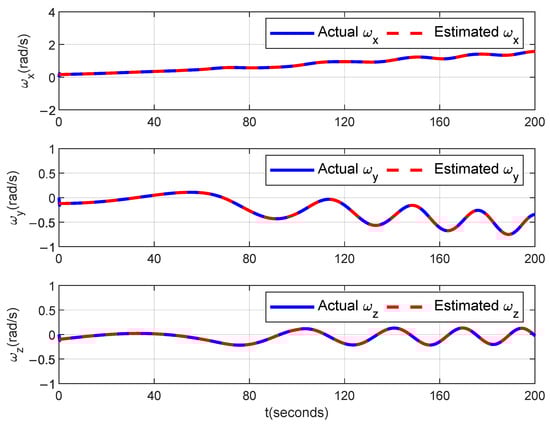 The estimation signals of the satellite attitude angular velocity with the MLO designed using Theorem 1.