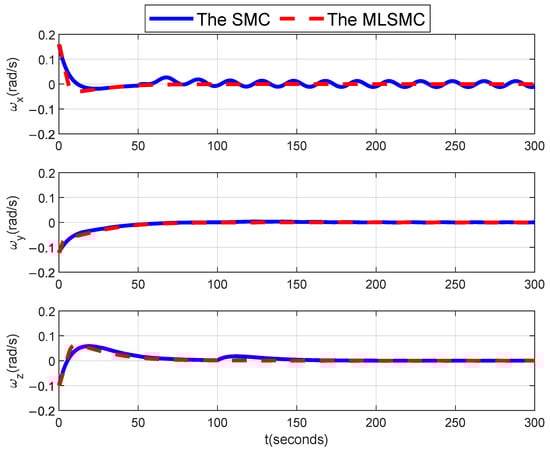 The curves of the satellite attitude angular velocity with the MLSMC and the SMC [31].
