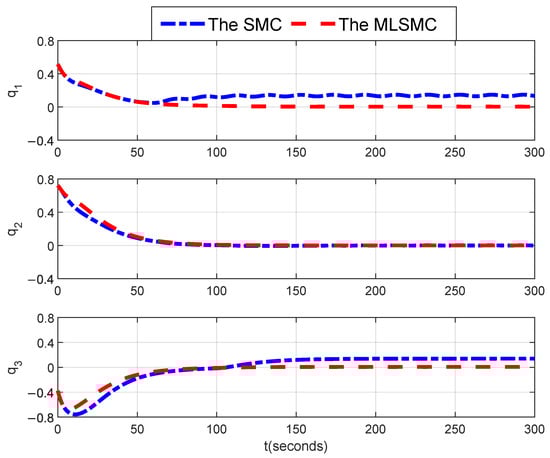 The curves of the satellite attitude quaternion with the MLSMC and the SMC [31].