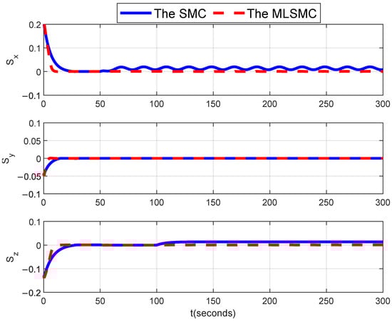 Related parameters are chosen and computed in Table 2. Based on the MLSMC design, simulation studies on MLSMC-based satellite attitude fault-tolerant stabilization control are performed, and related simulation results are demonstrated in Figure 7, Figure 8, Figure 9 and Figure 10. Additionally, a comparison between the proposed MLSMC approach and the SMC-based approach [31] is also provided. Under both approaches, the curves of satellite attitude angular velocity are illustrated in Figure 7, while the curves of the satellite attitude quaternion are illustrated in Figure 10. The stabilization control errors of satellite attitude angular velocity and of attitude quaternion under both approaches are computed and given in Table 3 and Table 4. From Figure 7, Figure 8, Figure 9 and Figure 10, it can be noted that the MLSMC and the SMC can guarantee the actual satellite attitude angular velocity and that the satellite attitude quaternion can converge to small neighborhoods of zero. However, from Table 3 and Table 4, it can be found that, compared with the SMC-based approach proposed in [31], it has higher stabilization control accuracy on the satellite attitude angular velocity and the satellite attitude quaternion. This is mainly because the actuator faults are accurately reconstructed using the MLO, and the mixed learning algorithm in the MLSMC strategy is adopted to compensate for the composite disturbance. In addition, the curves of the sliding mode surface under both approaches are demonstrated in Figure 9, while the curves of the compensation term for the composite disturbance are illustrated in Figure 10. Therefore, we can conclude that the proposed attitude stabilization control approach has actuator fault-tolerant capability and is effective and applicable for rigid spacecraft with actuator faults.