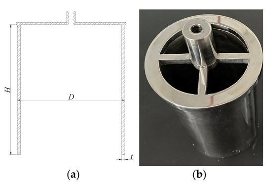 As shown in Figure 1, four skirt thicknesses were made with stainless-steel tubes, with a diameter D of 100 mm, height H of 120 mm, and thickness t of 1 mm, 2 mm, 3 mm and 4 mm. There was a cross-shaped fixing frame at the top of the cylinder for connecting nuts. The fixing frame was made into a cross shape to facilitate the exhaust of gas in the cylinder during penetration. The Young’s modulus of steel was set to 210 GPa.