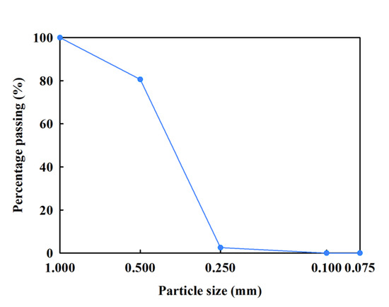 Quartz sand was used for the model tests. The particle diameters of sand used in this paper were greater than 0.075 mm and less than 1.0 mm, so the grading of sand was poor. The grading curve of quartz sand is shown in Figure 2. The minimum and maximum dry densities of the sand were 1.39 g/cm3 and 1.66 g/cm3, respectively. The sand used in the model tests had a relative density of 0.75, that is, the dry density was 1.5 g/cm3.