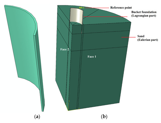 The CEL model is demonstrated in Figure 5. The loading reference point was taken at the top and along the centerline of the cylinder, as illustrated in Figure 5b. To improve the computational efficiency, only a quarter model was used in this paper by taking advantage of the symmetry of the model. The soil domain had a radius of 3.5D (i.e., 350 mm) and a depth of 5.5D (i.e., 550 mm), ensuring a sufficient coverage without any boundary effect through the entire penetration analysis [35]. A void layer was prescribed with a height of 0.5D (i.e., 50 mm) above the surface of the soil. The soil bottom was fixed vertical displacements while the soil side with cycles only allowed vertical displacements, and faces 1 and 2 (in Figure 5b) are axisymmetric boundaries.