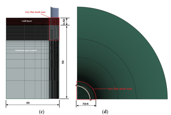 The entire soil domain was set as a Eulerian part, comprising linear reduced-integration Eulerian elements. A very fine mesh zone with a radius of 5D/8 (i.e., 62.5 mm) was set surrounding the steel cylinder with a minimum mesh size of t/6. The number of Eulerian elements was 5910464.