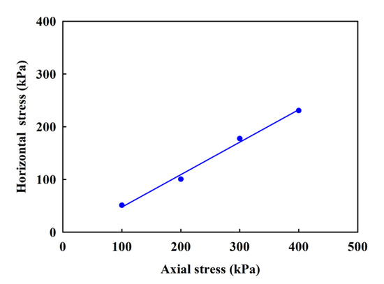 To obtain the constitutive model parameters of sand, a direct shear test was conducted, and the test results are shown in Figure 6. The internal friction angle φ and cohesion c of sand were 30° and 0 kPa, respectively.