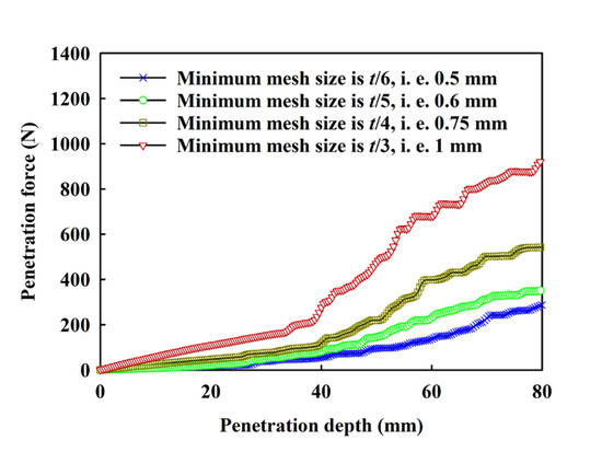 Relationship between penetration forces and penetration depth using different element size (minimum element size hmin of t/8, t/6, t/4, t/2, t).