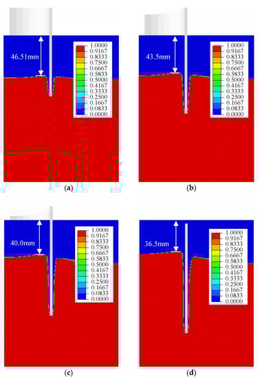 In the process of steel cylinder penetration, the flow of soil in the steel cylinder has an important impact on the penetration force of the steel cylinder. Figure 10 shows the evolution of the soil flow during the penetration process of a steel cylinder, with four selected penetration depths dp of 20, 40, 60 and 80 mm. Figure 10 shows that with increasing penetration depth, the uplift height of the soil mass in the steel cylinder increased, indicating that the soil mass separated from the cylinder wall gradually flowed into the steel cylinder with the penetration of the steel cylinder. The uplift height of the soil inside and outside the steel cylinder was inconsistent. With an increase in the penetration depth, the difference in the uplift height of the soil inside the steel cylinder gradually increased, indicating that most of the soil discharged from the cylinder wall entered the cylinder, and only a small part flowed to the outside of the steel cylinder. This is basically consistent with an offshore bucket foundation investigation by Xiao et al. [36].