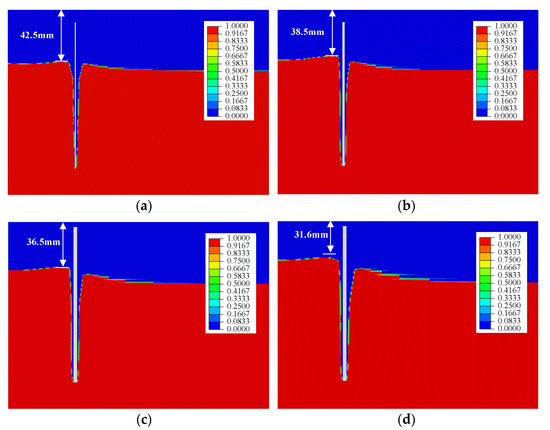 Soil heave height in a steel cylinder with different wall thicknesses after penetration: (a) t = 1 mm; (b) t = 2 mm; (c) t = 3 mm; (d) t = 4 mm.