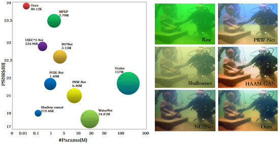 Underwater images have broad application value in the marine field, playing an essential role in marine scientific research [1,2] and protection and environmental monitoring [3]. However, underwater image quality is typically limited by the absorption, scattering, and attenuation of light, resulting in the loss of contrast, blurring, and color distortion. With the rapid development of computer vision, many scholars have conducted extensive research on Underwater Image Enhancement (UIE) and have made significant advancements in the field [4,5,6].