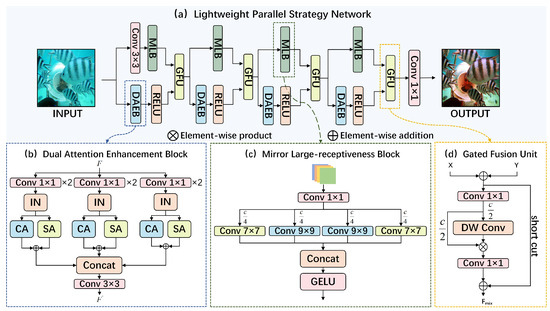 To address the above issues, we propose a Lightweight Parallel Strategy Network (LPS-Net) for underwater image enhancement. As shown in Figure 1, LPS-Net achieves state-of-the-art underwater image enhancement performance with very few parameters. Specifically, a Dual-Attention Enhancement Block (DAEB) and a Mirror Large Receptiveness Block (MLB) are proposed to, respectively, enhance color and restore detail in degraded images. Problem splitting can avoid the use of complex modules, as well as reduce the amount of computation and parameters. With the aim of achieving remarkable image color and detail rendering, we repeatedly employed these blocks on parallel branches at each stage of LPS-Net and designed a Gated Fusion Unit (GFU) to combine features from different branches.