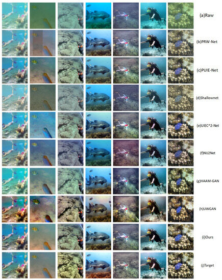In the case of the T90 dataset, a subset of images from the UIEB dataset was carefully chosen for conducting a visual comparison against seven state-of-the-art methods. These images were meticulously classified into various categories, encompassing yellow-toned, green-toned, blue-toned, low light, shallow-water areas, and deep-water areas. Figure 3 and Figure 4 showcase the performance of each method. Shallownet succeeded in enhancing contrast, but fell short in improving the quality of yellow-toned and green-toned underwater images. UWGAN exhibited notable improvements in yellow-toned images; however, oversaturation issues arose in many instances. PRW-Net’s applicability was limited across a wide range of scenarios, as it introduced additional chromatic aberrations or artifacts in deep-water areas and low-light conditions. UIEC⌃2-Net employed a multicolor spatial encoder for natural color processing, but inaccurate transmission map estimation resulted in contrast and saturation degradation. PUIE-Net and NU2Net encountered challenges with overall darkness and low contrast in a majority of the processed images. In contrast, our method effectively combines the strengths of multiple features, resulting in visually pleasing outcomes in terms of contrast, saturation, and detail processing.