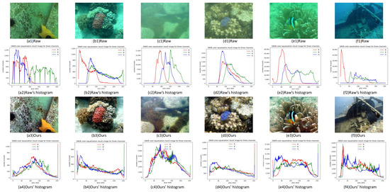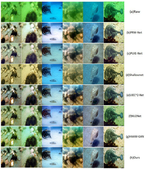 Publicly available datasets were analyzed in this study. These data can be found here: https://drive.google.com/file/d/12W_kkblc2Vryb9zHQ6BfGQ_NKUfXYk13/view (accessed on 20 October 2022), https://drive.google.com/file/d/1cA-8CzajnVEL4feBRKdBxjEe6hwql6Z7/view (accessed on 20 October 2022), https://drive.google.com/file/d/1Ew_r83nXzVk0hlkfuomWqsAIxuq6kaN4/view (accessed on 20 October 2022), and https://github.com/IPNUISTlegal/underwater-test-dataset-U45- (accessed on 20 October 2022). The divided UIEB dataset has 800 pairs of quantity images and 90 pairs of test images: https://pan.baidu.com/s/1dylR8g2lMK5Cd2eIVm_XLQ?pwd=r3i2 (accessed on 20 October 2022).