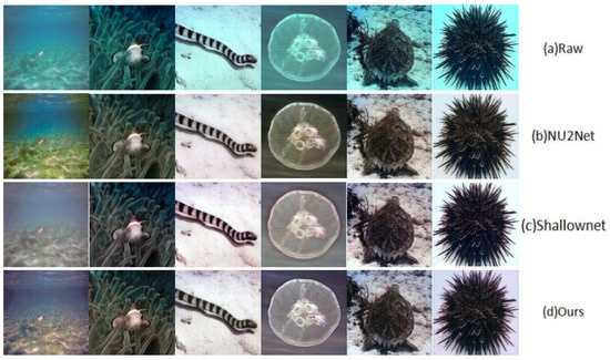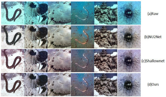 Further, we also give an intuitive comparison with two previous SOTA methods on the EUVP dataset. As seen in Figure 8 and Figure 9, Shallownet was incapable of sufficiently restoring underwater images due to its straightforward network structure. On the other hand, NU2Net lacked precise color control, hence leading to visible chromatic deviations that can be noticed by the human eye. In contrast, our method was better at removing color casts and handling details.