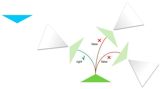 The maneuvering decision problem in air combat can be regarded as a task with sparse rewards. The schematic diagram of air combat maneuver decision-making is shown in Figure 2, which shows three possible results of decisions. The green aircraft and the blue aircraft represent the two sides of air combat. The solid lines represent the flight trajectories generated by the green aircraft, and the gray triangles represent the off-axis angle of the missile. As shown in the two red trajectories of Figure 2, due to the fact that the azimuth angle of the target is larger than the off-axis angle, the missile will miss the target if it is launched. Only if the target azimuth angle is less than the off-axis angle can the missile possibly hit the target, as shown in the green trajectory of Figure 2.