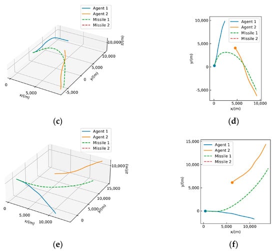 In simulation 1, both agents adopt random decisions. The initial yaw angle of Agent 1 is −138.0°, and the initial yaw angle of Agent 2 is −74.4°. From Figure 4b, it can be seen that due to the untrained nature of the agents, they do not make any effective decisions. Agent 1 launches the missile at the beginning of the simulation, while Agent 2 launches the missile after flying forward for some time. However, both missiles miss the target; thus, the simulation ends.