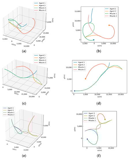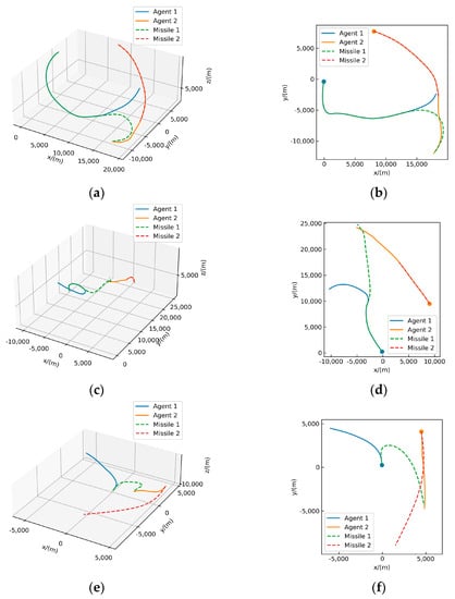 In simulation 2, the initial yaw angle of Agent 1 is 67.6°, and the initial yaw angle of Agent 2 is −60.0°. From Figure 4d, it can be seen that both Agent 1 and Agent 2 choose to launch missiles at the beginning of the simulation, and Missile 2 misses the target. Finally, Missile 1’s flight time exceeds 27 s; thus, the simulation ends. In simulation 3, the initial yaw angle of Agent 1 is −3.3°, and the initial yaw angle of Agent 2 is 36.1°. From Figure 4f, it can be seen that Missile 2 misses the target because of the off-axis angle, while Missile 1 misses the target because of the maximum flight time. As shown in the above scenario, without training, agents maneuver randomly; therefore, they cannot make any rational and effective decisions to hit the target.