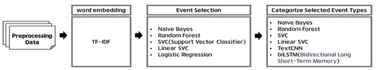 In this study, TF–IDF was used as the word-embedding method for machine learning. TF–IDF is a statistical method that calculates the relative importance of words in text data and assigns weight values based on word frequency throughout an entire document [19]. Thus, it reflects the importance of each word in a document. Through this approach, the model can know the meaning and relative importance of words to accurately identify event types.