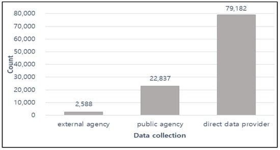 Data provided by agencies such as TBN Korea Traffic Broadcast, Twitter, Korea Expressway Corporation, etc., were used for this evaluation [31]. TBN Korea Traffic Broadcast is one of South Korea’s terrestrial broadcasting stations and airs programs covering to 24 h traffic information. Table 3 shows the characteristics of the collected data. For the performance evaluations, we used data from 5 March 2021 to 30 September 2021, excluding data for July, as the training dataset, whereas data from 1 July 2021 to 31 July 2021 were used as the test dataset. We used TBN Korea Transportation Broadcasting data, which includes data from Twitter, broadcast stations and so on, without collecting data directly from external sources such as Twitter and broadcast stations. We collected and managed TBN Korea Transportation Broadcasting data through web crawling. The TBN data set consists of data from external agencies such as Twitter and broadcasting stations, data from public agencies such as Korea Expressway Corporation and Central Traffic Information Center, and data from direct data providers such as avid viewers and citizens. Figure 5 shows the distribution of the TBN data set. The size of data from external agencies such as Twitter and broadcasting stations is 2588. The size of data from public agencies such as Korea Expressway Corporation and Central Traffic Information Center is 22,837. Finally, the size of data from direct data providers such as avid viewers and citizens is 79,182.