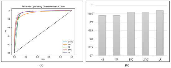 Figure 6 shows the ROC curves and AUC of the binary classifiers. Figure 6a shows the ROC curves of the naïve Bayes, random forest, SVC, linear SVC, and logistic regression binary classifiers. The curves indicate that the true positive rates (TPR) and false positive rates (FPR) of the five models used for the proposed technique were close to one. The AUC results in Figure 6b show that all five models had performance levels of ≥0.9. SVC, linear SVC, and logistic regression had the best performance levels with values of ≥0.95.