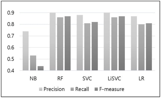 Figure 9 shows precision, recall, and F-measures for each class. For the Construction class, linear SVC and SVC performed best, with precision, recall, and F-measure values of 0.92, 0.93, and 0.92, respectively. For the Weather class, the naïve Bayes model showed the best values, at 0.8, 0.82, and 0.86, respectively, whereas random forest showed the second-best values at 0.68, 0.93, and 0.78, respectively. For the Accident class, random forest, linear SVC, and SVC showed the highest precision, recall, and F-measure values at 0.98, 0.98, and 0.98, respectively. For the Congestion class, linear SVC and SVC had the highest performance, with values of 0.8, 0.98, and 0.88, respectively. For the Crowded Event class, linear SVC had the highest values, at 0.83, 0.68, and 0.75, respectively, whereas SVC had the second-highest values, at 0.7, 0.68, and 0.73, respectively. Finally, for the Others class, linear SVC and SVC had the highest values at 0.94, 0.6, and 0.73, respectively, and 0.94, 0.58, and 0.72, respectively.