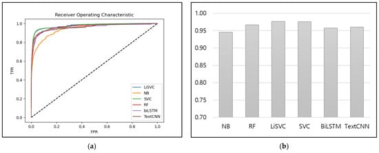 Figure 11 shows the AUC values for AB and WB. The AUC results for the AB and WB models show no differences between AB and WB for the naïve Bayes, random forest, and SVC models, which had AUC values of 0.95, 0.97, and 0.98, respectively. In the linear SVC model, the AB result was 0.98, and the WB result was 0.97, indicating that the AB value was higher by 0.1. In the BiLSTM model, the AB model was 0.96, and the WB model was 0.94, corresponding to a 2% difference. In TextCNN, the AB result was 0.96, and the WB result was 0.94, indicating that the AB value was 2% higher in both models.