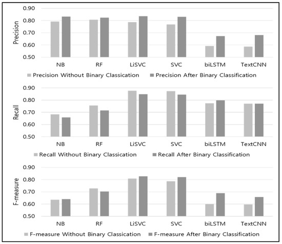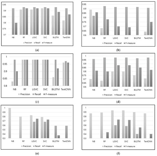 Figure 12 shows the precision, recall, and F-measures of the AB and WB models. The precision results show that AB improved the performance of all evaluated models. For the linear SVC model, which we selected as the most suitable classifier in earlier parts of the study, the value for WB was 0.79. By contrast, the value for AB was 0.84, which was 5% higher. In terms of recall, WB generally showed higher performance. However, in the case of BiLSTM, AB’s performance was 2% higher, whereas TextCNN exhibited the same results for WB and AB. Finally, concerning the harmonic means for precision and recall, random forest WB had a value of 0.73, whereas AB had 0.70, indicating WB’s superior performance. By comparison, AB outperformed the rest of the models (excluding random forest). In the case of the linear SVC model, the value for WB was 0.81, whereas that for AB was 0.83, confirming AB’s superior performance.