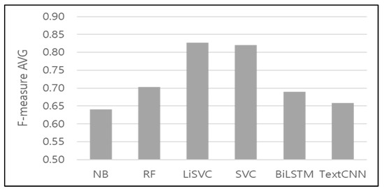 To compare the overall classification performance of the six models, Figure 10 shows the average values of their F-measures, which show that linear SVC had the best performance, with an average value of 0.83, corresponding to a performance difference of approximately 19% compared to that of the naïve Bayes model. In our research, it was shown through performance evaluations the Linear Support Vector Machine (LSVM) achieved much better performance than Convolutional Neural Networks and naïve Bayes. These results suggest that models that perform predictions focusing on the correlations between specific words and labels rather than the inter-relationships between words within sentences are more consistent with our data characteristics. In other words, our crowdsourcing data are composed of specific words rather than relationships between words. Therefore, we show better performance when we apply our crowdsourcing data to SVM. As a result of the performance evaluations, linear SVC was chosen as the most suitable model for use as the binary classifier and the multi-class classifier for event classification.