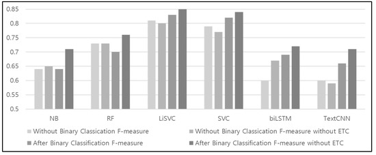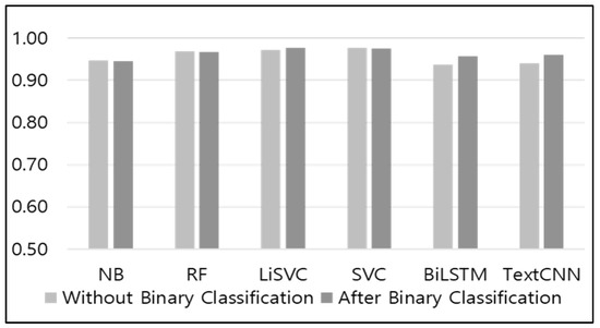 The machine learning models used in the binary classifier are naïve Bayes, random forest, SVC, linear SVC, and logistic regression. The parameters for all of the models are set to default. Machine learning models used in multiple classifiers are naïve Bayes, random forest, SVC, linear SVC, BiLSTM, and TextCNN. The parameters for naïve Bayes, random forest, and BiLST are set to default values. TextCNN constructs a Convolutional Neural Network (CNN) based on the model proposed in [14]. We applied dropout to the proposed technique to improve generalization and avoid model overfitting. We set the parameters of the linear SVC model to C = 1.0, penalty = “L2”, multi_class = “ovr”, and the parameters of the SVC model to C = 1.0, kernel = “rbf”, decision_function_shape = “ovr”. In the linear SVC and SVC models, we changed the value of C from 0.1 to 1000, but there was no significant change. Therefore, we performed a performance evaluation by changing the value of C to 1.0.