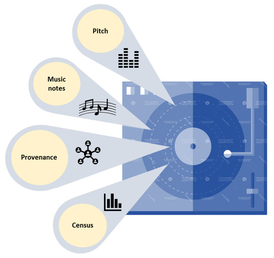 Generally, music comes in one of two digital formats. The first format is the acoustic representation, where the audio intensity is recorded about the time while being sampled at a particular frequency. Examples of acoustic music formats include mp3, mp4, and .au files. The second format is the structural representation, where music is described by musical scores, which give information such as pitch values or duration of notes. Examples of structured music formats include MIDI and humdrum data. Score-based musical data are quite suitable for similarity-based computation in MIR. In this paper, we use structured music data for plagiarism detection. We classify the musical data used into three categories: (1) musical notes, (2) pitch data, and (3) census data. We also introduce the use of provenance data in music similarity comparison as a fourth category to consider in comparisons, as shown in Figure 1. In this paper, we use a combination of music data through “http://kern.ccarh.org/ (accessed on 20 May 2018)”, provided by the Center for Computer-Assisted Research in the Humanities (CCARH) at Stanford University. It hosts a large collection of music scores in the Humdrum file format, which is a plain-text file format used for representing musical data.