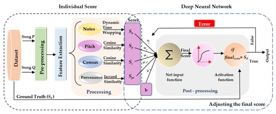 As shown in Figure 3, the feature similarity results, Sn, Sp, Sc, and Spr, are produced by comparing two songs, Q and P. Moreover, these similarity results are at first just the initial values of neurons along with their randomly given weights. In the recursive process, the final output of all the values based on their weights is computed and compared with the desired output Rd. Moreover, based on the differences between the desired output and the output produced by the modules, the weights are adjusted in each iteration. Biases (B1 and B2) of the module also contain weight values, which help in making weight adjustments. We use a backpropagation algorithm to achieve the desired combinations of weights in the neural network. Backpropagation consists of applying the chain rule to all possible paths in our network. It is a dynamic programming-based algorithm that reuses intermediate results to calculate gradients. After this, it transmits the intermediate errors backward. The algorithm implements a function Xn = Fn (Wn, Xn−1), where Xn is the output vector representing the similarity between two songs. Wn represents the weights module, and Xn−1 represents the output of the previous iteration and the input vector of the current module.