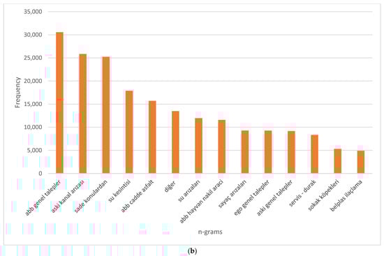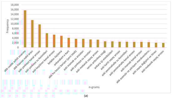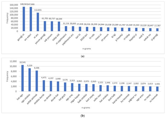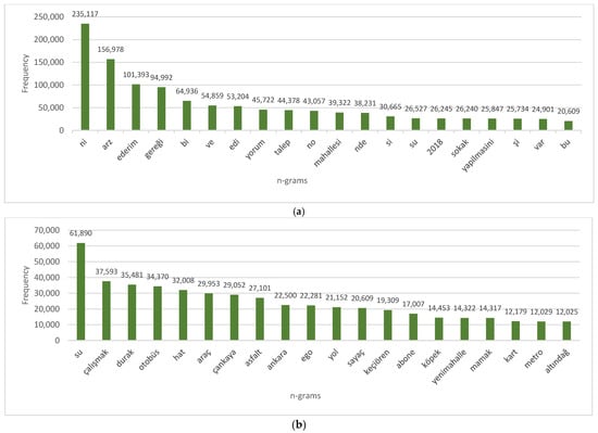 When the raw data are analyzed, the most repeating 20 unigrams are presented in Figure 3a. When the word clusters and the most repeated terms are examined, the corpus contains a large number of useless terms. For example, the spelling “ni” is replicated over 200,000 times, which is meaningless in Turkish. Because of the users’ spelling mistakes, such typos are incorporated into the inquiries. Furthermore, due to citizen spelling errors, some of the terms in the bigrams appear to be nonsensical.