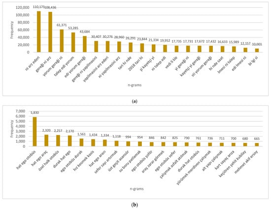 Figure 5a depicts the most-often-occurring trigram terms before data preparation. Word groupings that were nonsensical before preparation have become comprehensible and coherent after preparation. To see the associated terms, the trigrams give a clearer statistic. Terms such as “ni arz ederi” and “gereği ni arz” are highly repeated in trigram analysis before preparation, as shown in Figure 5a, while terms such as “hat ego otobus” and “durak hat ego” are highly repeated after data preparation, as shown in Figure 5b. Again, here, the data make more sense after the preparation.