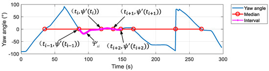 Similar to obtaining set through Criterion 1, set can be yielded through Criterion 2. The meaning of Criterion 2 is that, for the zero-crossing points and , if the maximum fluctuation value of the yaw angles near them is less than the threshold c, it is determined that both of them are caused by small deviations in the yaw angles, but not the zero-crossing points that can represent a hover or S turn.