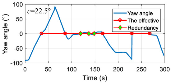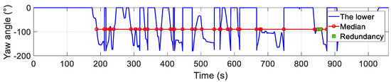 Figure 11 uses the median-crossing de-redundancy algorithm in Section 3.2 to eliminate the redundant marks with a yaw angle deviation less than the threshold c = 22.5° so as to verify the correctness of the algorithm. The signal selected to illustrate the algorithm was the lower part of the original layer , that is . In the figure, the set of the median is shown as circle symbols, and the set of the redundancy algorithm as diamond symbols; then, the de-redundant set can be worked out using .
