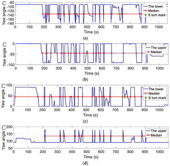 Figure 13 shows the four sublayers – and the statistical results of the second layer, where Figure 13a,b comes from and the other two from . Although there are still many medians in each sublayer signal compared to the previous layer, there were fewer effective marks for S turns. Using the de-redundancy algorithms in Section 3.2 and Section 5.2, the number of S turns with and are shown in Figure 13a,c, respectively, and there were no S turning marks in Figure 13b,d, indicating that or there were no S turning actions in these two sublayers. Therefore, the number of S turns obtained from Figure 13 was
