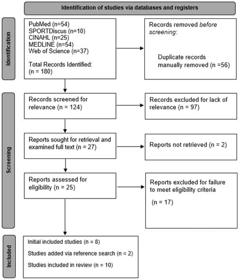 A total of ten articles met the eligibility criteria from the 180 articles initially retrieved from the five databases [3,21,22,23,24,25,26,27,28,29]. This systematic review utilized a PRISMA diagram to visually depict the search process from initial search to final article inclusion (Figure 1).