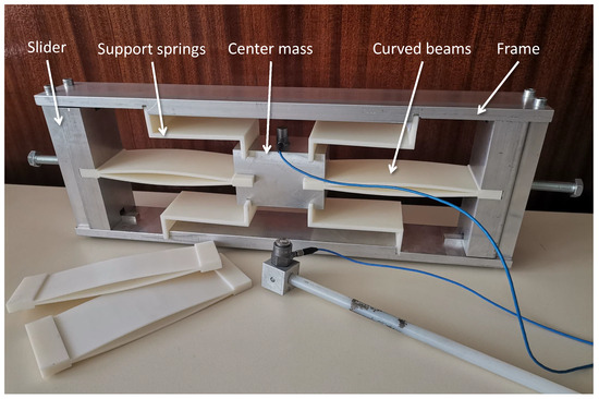 The frame with sliders and center mass are made of structural aluminium, with mass density kg/m and Young’s modulus GPa. After weighing the 3D-printed spring components and modal testing, the mass density of the ABS parts and the Young’s modulus are estimated from the first cantilever mode. Values are reported in Table 1.