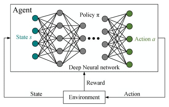 As an artificial intelligence method, deep reinforcement learning combines deep learning [24,25] and reinforcement learning [26,27]. The agent has strong perception ability in deep learning and strong decision-making in reinforcement learning. Deep reinforcement learning complements the advantages of both and the basic principle of deep reinforcement learning is shown in Figure 1.