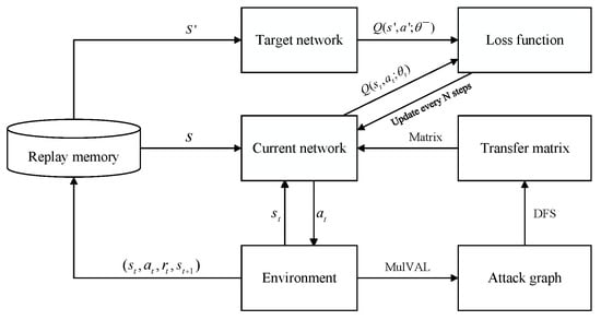 The transfer matrix is input into the DDQN algorithm and the agent starts training to obtain the best attack path by the deep neural network, -strategy, network delay parameter update, experience replay and loss function calculation. As shown in Equation (9), the loss function is the mean square error (MSE) of the difference between the current Q network value and the target Q network maximum value.
