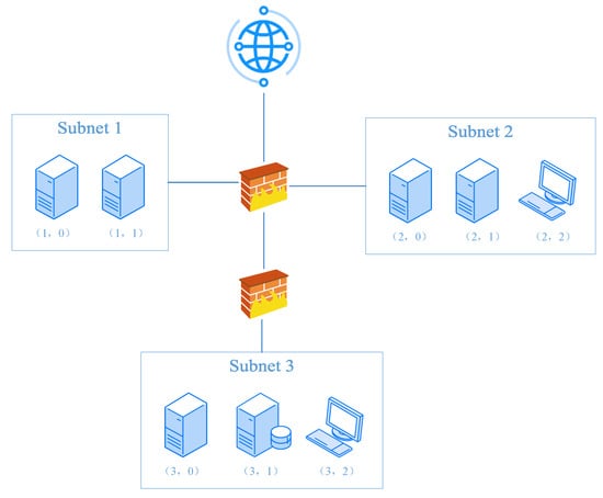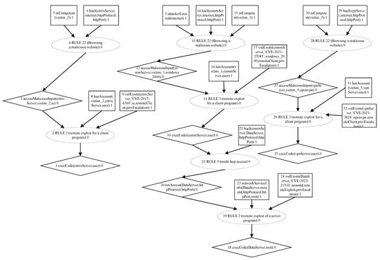The attack graph generated by Mulval is shown in Figure 3. The network shown in Figure 4 is scenario 1 of the penetration testing, which includes 3 subnets and 8 hosts. The subnets are separated by firewalls. The firewall only allows traffic that has been set in advance, and the host can communicate within the same subnet. The specific configuration of each host is shown in Table 2. The attacker performs vulnerability exploitation and privilege escalation operations based on the existing vulnerabilities and the running processes of the host.
