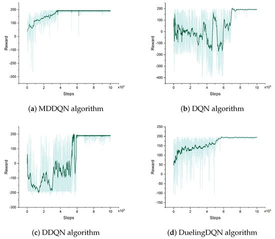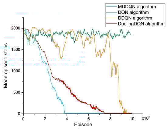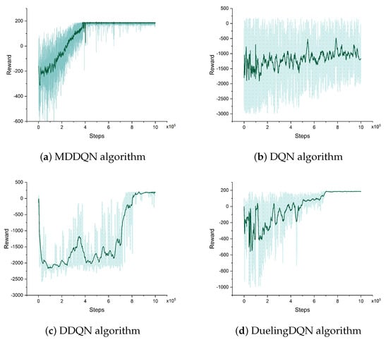 As the complexity of the experimental scenario increased further in scenario 3 shown in Figure 7, the advantage of the MDDQN algorithm became more significant, with a more stable training process and the highest convergence efficiency.